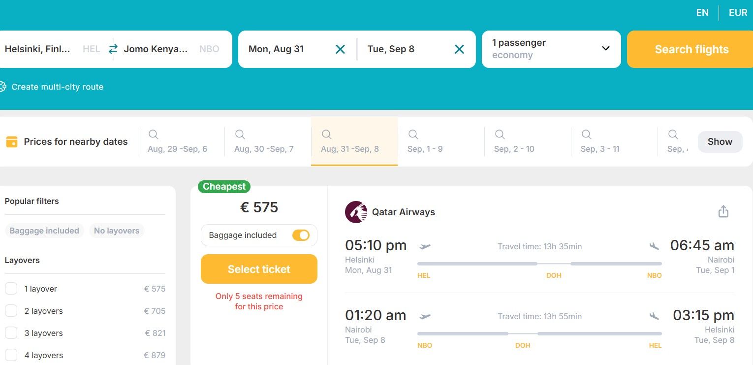 Currently, you can book your round-trip Economy Class ticket from Helsinki, Finland to Nairobi, Kenya for only € 575.