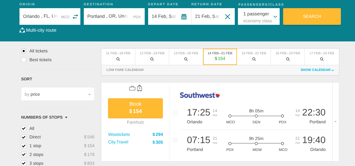 Southwest Airlines is thrilled to offer you economy flights from Orlando, FL, USA to Portland, OR, USA for an unbeatable US$ 154 round trip.