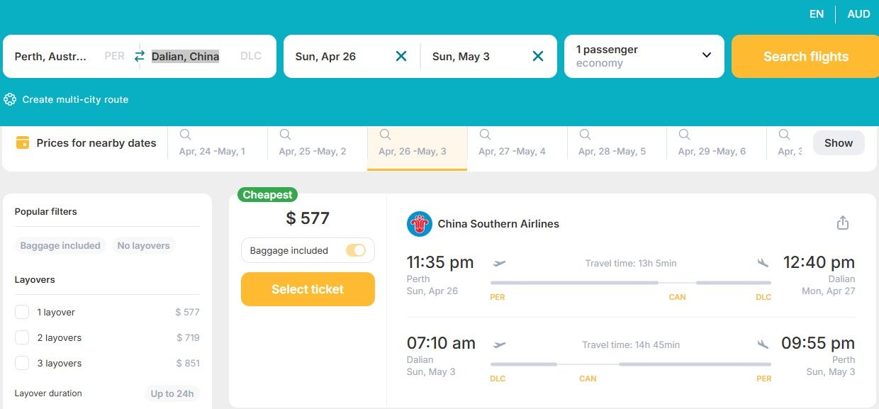 Currently, you can book your round-trip Economy Class ticket from Perth, Australia to Dalian, China for only A$ 577.