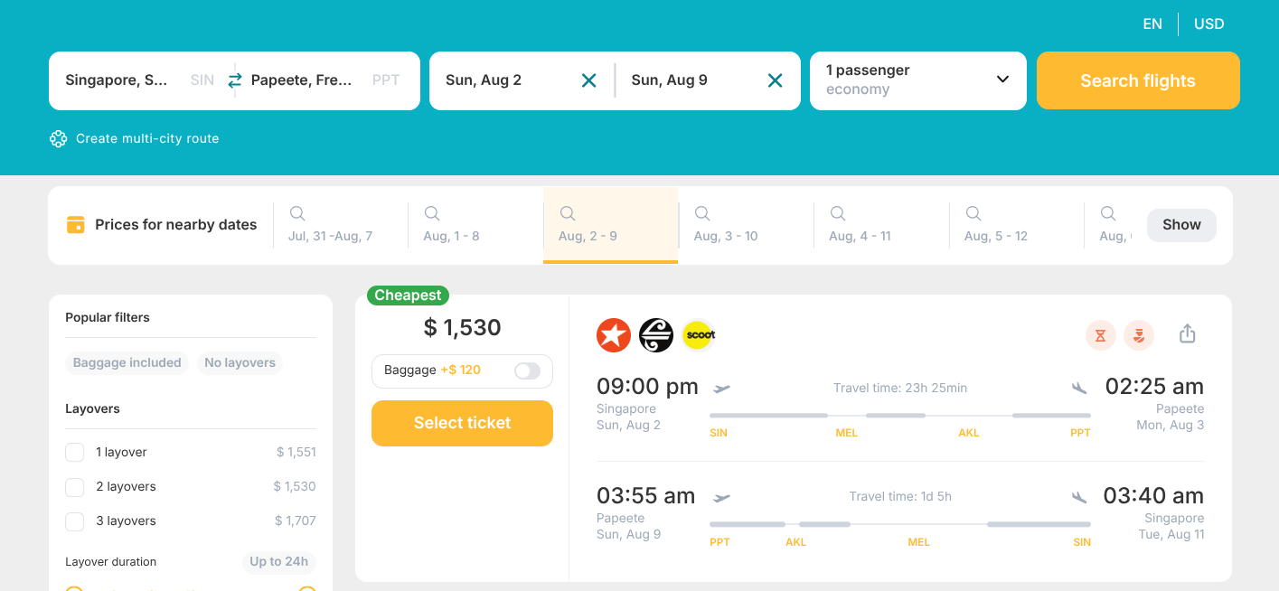 Currently, you can book your round-trip Economy Class ticket from Singapore to Papeete, French Polynesia for only US$ 1,530.