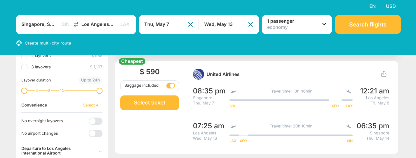 Weโve found incredible flight deals to Los Angeles from Singapore starting at just US$ 590 (RT).