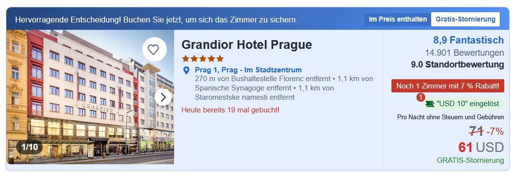 Book your stay at this well-rated 5-star Grandior Hotel Prague, Czech Republic, Prague with fabulous reviews for just US$ 61 room/ night with free cancellation (incl. tax).
