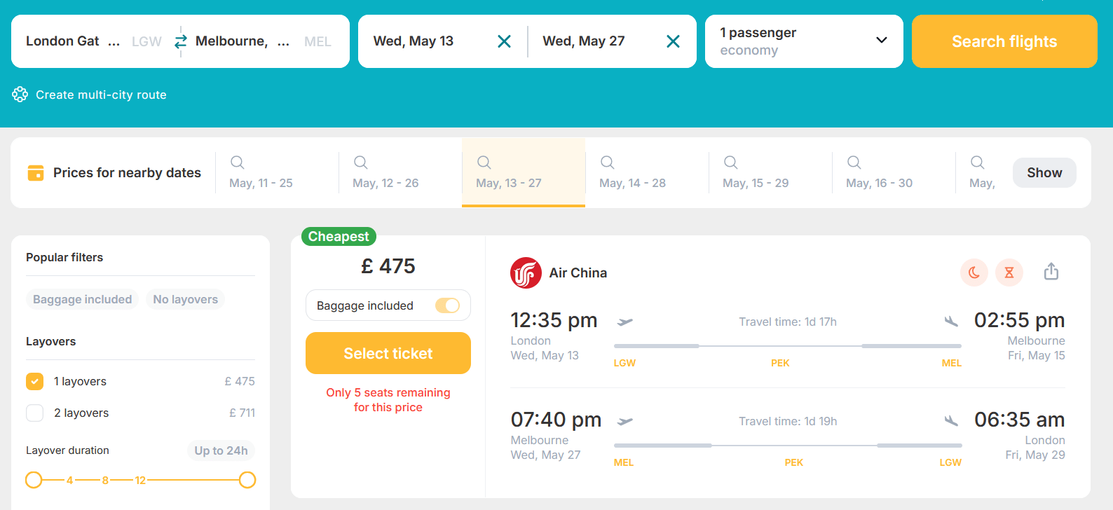 AIR CHINA is thrilled to offer you an exclusive flight deal from London, UK to Melbourne, Australia for an unbeatable ยฃ475 round trip.