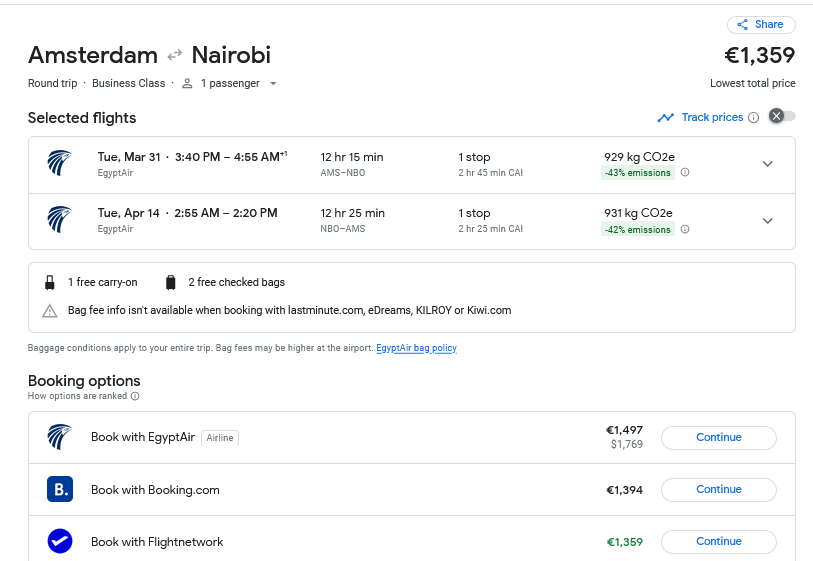 Currently, you can book your round-trip Business Class ticket from Amsterdam, Netherlands to Nairobi, Kenya for only €1,359. This deal is available with Egyptair in BUSINESS CLASS!