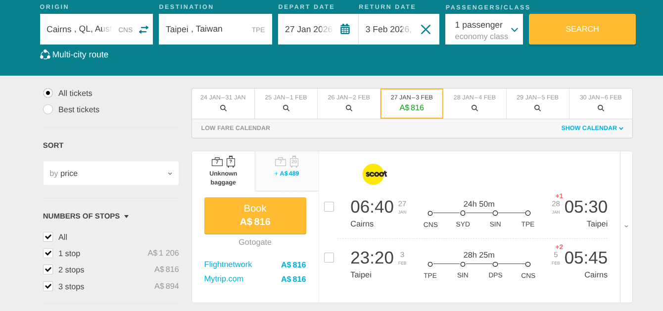 Currently, you can book your round-trip Economy Class ticket from Cairns, Australia to Taipei, Taiwan for only A$816.
