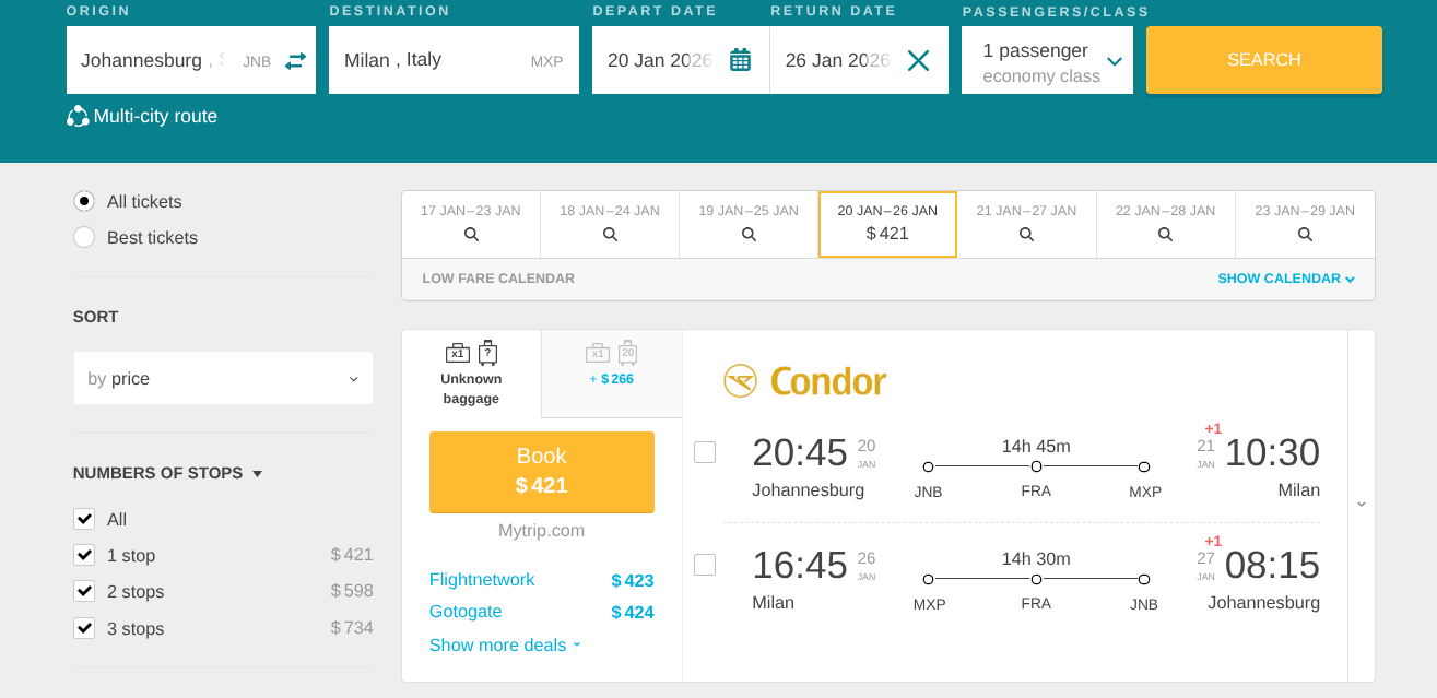 CONDOR is thrilled to offer you economy flights from Johannesburg, South Africa to Milan, Italy for an unbeatable US$421 round trip.