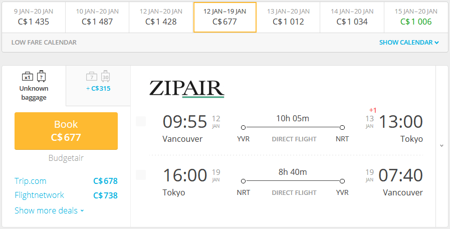 ZIP AIR is offering discounted nonstop flights from Vancouver, BC, Canada to Tokyo, Japan starting at only C$ 677 for a round trip!