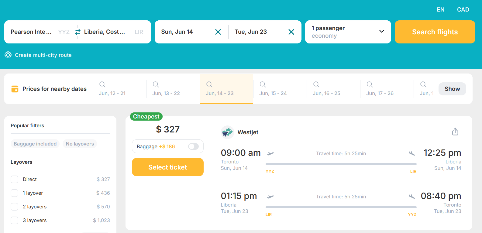 WESTJET AIRLINES currently offer you an exclusive nonstop flight deal from Toronto, Canada to Liberia, Costa Rica for an unbeatable CA$ 327 round trip.
