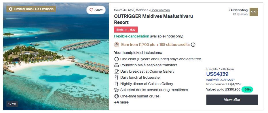 Book your stay at this well-rated 5-star Outrigger Maldives Maafushivaru Resort in Maldives with fabulous reviews, 5 Nights in a OVER-WATER Villa now available for just US$ 4139 /villa. Itโs the iconic OUTRIGGER barefoot luxury you love in the worldโs most spectacular destination: surrounded by lush gardens, warm sands and the brilliant-blue South Ari Atoll.