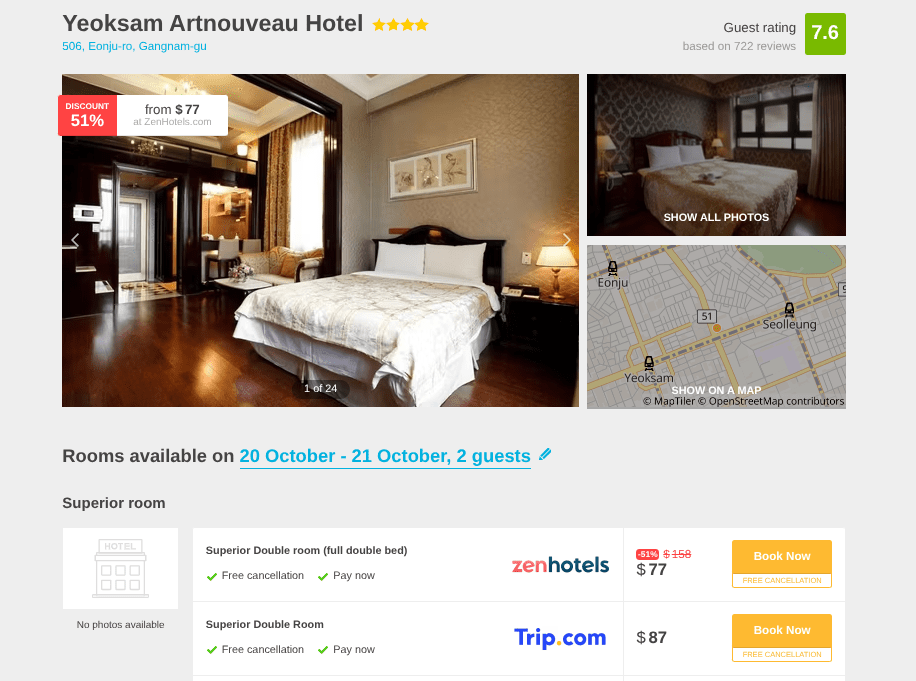 Book your stay at this top-rated 4* Yeoksam Artnouveau Hotel in Seoul, South Korea with fabulous reviews for just US$ 77 per room/night incl. tax (with free cancellation).